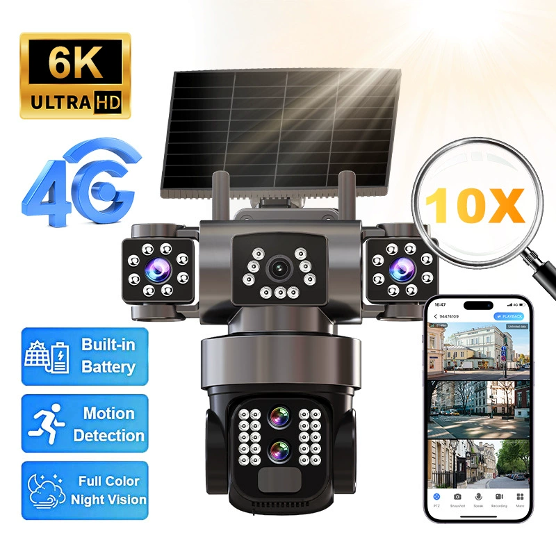 9MP 10x zoom 4-lens 4G solar-powered surveillance camera 3PTZ HD night